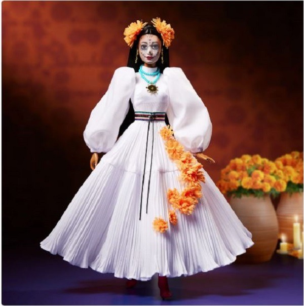 In honor of Día de Muertos, Barbie teams with renowned Mexican designer Kris Goyri to celebrate this festival of remembrance. Showcasing Goyri’s signature fusion of traditional Mexican culture with modern elements, Barbie doll wears a pleated white gown with voluminous sleeves, accented by vibrant marigold flowers and a festive headpiece. Her look is complete with a turquoise necklace featuring a radiant golden pendant, plus matching earrings, and bold burgundy boots.