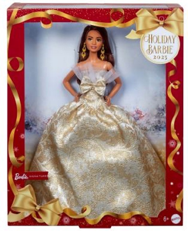 The 2025 Barbie Holiday Doll is ready to embrace the delights of the season in style. She’s dressed for festive revelry in a voluminous gown with a silver and golden brocade pattern – an homage to holiday décor. The dress is packed with glamorous details, including a dramatic tulle-accented neckline and an oversized bow, complemented by cascading golden earrings and matching mules. In packaging that’s ideal for display, this doll is a perfect addition to collections or holiday wish lists.