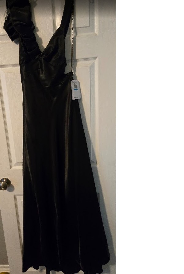 This beautiful black long dress has straps with ruffles on one of the straps. It has a back zipper.