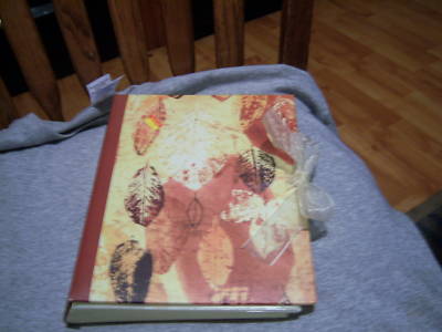 it is Yellow with brown & gold leaves, ties with a Satin Yellow Ribbon.