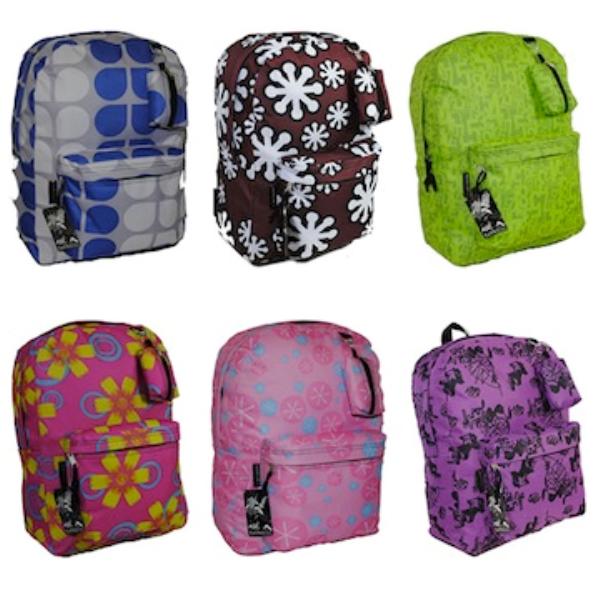 This stylish, printed backpack is extremely durable and made to last.The backpack has one large, main compartment, a midsize compartment on the front with an additional two small pockets. Its straps have slight padding and are built for flexibility, comfort and durability. Dimensions: 17""x12""x6"" Comes in 6 assorted style prints." Case Pack 24 Please note: If there is a color/size/type option, the option closest to the image will be shipped (Or you may receive a random color/size/type).