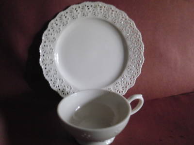 FINE PIERCED LACE SOUP CUP AND SAUCER BRAND NEW. DUE TO THE DELICATE NATURE OF THIS ITEM NO RETURN IS EXCEPTED