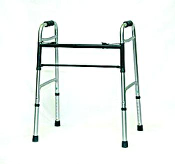 Features easy to use push button mechanisms that may be operated by fingers, palm or side of hand. Each side operates independently to allow easy movement through narrow spaces and provide greater stability when standing. Front cross-braces near top of walker to allow full stride. Sturdy, 1 diameter aluminum tubing provides stability, while remaining lightweight. Folds to a slim 4.5 for easy transportation and storage. Width between handgrips 20, height adjusts from 30-43.5 in 1 increments. Weight capacity 500lbs. 5 year warranty on Walker (#1090), 90 days on Wheel Kit (#1957). Case of 4.