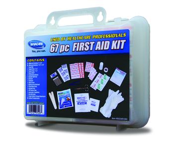 Contains 67 pieces in an organized, clear case. Designed to be used for common injuries, such as cuts, sprains, minor burns, insect bites, or splinters. Includes: 1 Cold Pack 3 Sting Relief Pads 25 Bandages 1 Tape Roll 10 Cotton Tip Applicators 4 Gauze Pads & 1 Gauze Roll 1 Finger Splint 1 Tongue Depressor 2 Vinyl Exam Gloves 5 Packets Burn Cream 1 Packet Antibacterial Ointment 3 Alcohol & 3 PVP Iodine Pads 3 Antiseptic Towelettes 1 Scissors 1 Tweezers 1 First Aid Instruction Card