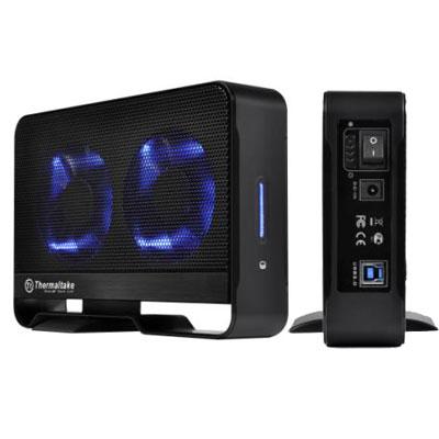 Thermaltake Max5G Hard Drive Enclosure Active Cooling With Two 80mm Blue LED Fans USB 3.0 5.0Gbps ST0020U. Dual ultra-silent 80mm fans with blue LEDs ensure data integrity during file transferring between external hard disk and the host computer. Easily turn off blue LEDs with built-in switch on the back of the enclosure. Blazing file transfer speed utilizing the world?s fastest SuperSpeed USB 3.0 transfer speed of up to 5Gbps. Backwards compatible with all USB 2.0 (up to 480 Mbps) and USB 1.1 hosts. Supports for all 3.5? SATA I II and 6G Hard Drives up to 2TB. Includes shielded USB 3.0 cable to ensure maximum transfer speed with minimum distortion. Integrated stand easily twists out for added overall enclosure stability.