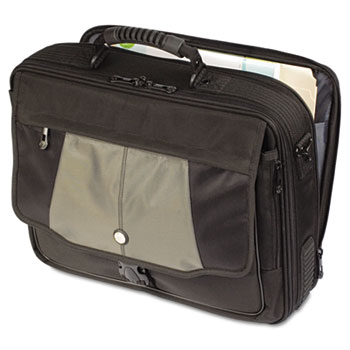 Patented Dome Protection System keeps screen from being jammed into keyboard during travel and prevents scratches. Front flap pocket provides quick access to important items. Main compartment includes large mesh pocket and two padded pockets for accessories. Separate dedicated file section provides additional storage. Rubber-like tread protects bottom. For Device Type: Notebook; Material(s): Polyester; Nylon Twill; Carrying Method: Carrying Handle; Shoulder Strap; Color(s): Black/Gray.