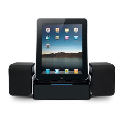 The iMM747 Audio Cube is the first fully-dedicated iPad stereo docking station in the market and is in every way an Apple user's dream. Although originally designed with the iPad user in mind the iMM747 conveniently docks with your Apple iPhone 4 or iPod as well and features an adjustable mounting design. The Audio Cube is the perfect complement to your iPad not only because of its ideal compatibility but in its simple and clean design which reflects the aesthetic streamlined and metallic finish of the iPad itself. The iMM747's outstanding sound clarity and resonance coupled with its solid bass and hovering dual speakers makes it the perfect iPad desktop or bedside speaker dock. Unique Features: With its sleek design and friendly user interface the Audio Cube provides two speaker channels each with iLuv's enhanced jAura Soundcell Technology which showcases a tweeter main audio driver and a powerful built-in radiator subwoofer for heart-thumping bass. With three jumbo engines the iMM747 is an amazing audio dock which will launch you to a new level of music enjoyment as you listen to superior quality sound. Naturally the Audio Cube provides a quick-charge for your iPad when docked. Additionally it has the unique ability to sync with a Mac or PC to transfer or edit content from the user's iTunes library. The dock seamlessly switches from charging your iPad to syncing it with a Mac or PC without removing your iPad from the dock. The iMM747 features easy docking via an adjustable sliding docking wall which provides secure iPad vertical support and a flexible 30 pin connector that automatically adjusts to dock not only your iPad but your iPhone 4 or iPod. The iMM747 is not only a perfect fit for the current iPad but an absolute choice for future iPad iPhone and iPod with similar size and thickness. One of the reasons Apple enthusiasts buy an iPad iPhone or iPod is the Apps. As our previous products the iMM747 is also App-friendly. With the Audio Cube the user can enjoy endless free downloads and updates of iPad App software beginning in early 2011. iMM747 Also Plays Other Devices The iMM747 also features an auxiliary line input to connect with other audio devices with a 3.5mm port and jack. What's in the box: Audio Cube iMM747 Mini to USB cable AC Adapter.