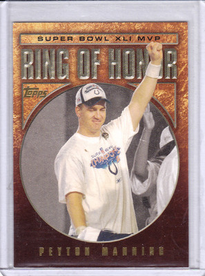 FOR THIS AUCTION: You are bidding on a 2007 Topps Ring of Honor #RH41-PM Peyton Manning Card....Shipping in the United States is $1.75 for the first card and only $.25 for each additional card won within a 72hr window..International Shipping is $4.00 for the first card..I will send an invoice with the shipping discount..Payment is due within 5 days after auction ends...Thank you for looking and good luck..Plz email any ?'s you may have..