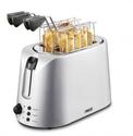 - Tostapane color argento - Capacità 2 fette - Fessure extra _ large (38 mm) - Cassetto raccogli-briciole estraibile - Timer con autospegnimento - Spia di riscaldamento - Pulsante di riscaldamento - Tasto _Cancel_ per interrompere la tostatura - Funzione scongelamento - Spia luminosa di scongelamento - 7 impostazioni di tostatura - Spia luminosa di accensione - Sensore di temperatura - Sistema espulsione automatica - In dotazione: griglia scalda pane/brioche, 2 pinze