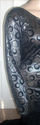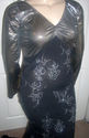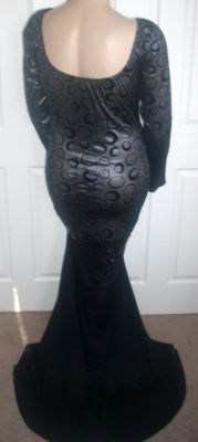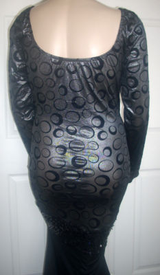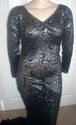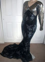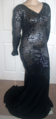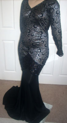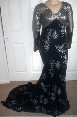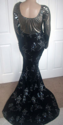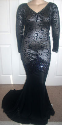 Girls! The bodice of this MORGAN WELLS original is made of a beautiful dark silver shimmer stretch knit with a black velvet circle design. It has a V neckline, and long straight sleeves. It has a scooped neckline in the back. At the lower hip is a band of black stretch sequins. Use the "ZOOM" feature for a close look. From the knee down is made of a black stretch knit. It is form fitting with a fabulous train, and is sized 16-20!