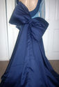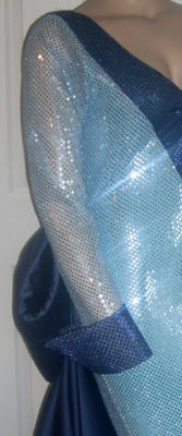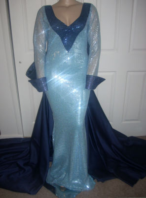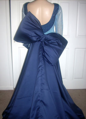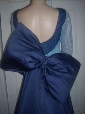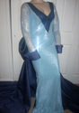 Girls! This is a fabulous item! This MORGAN WELLS original is made of light blue confetti stretch sequins. It has a V neckline outlined in navy sequins, and long straight sleeves with navy sequin cuffs. It is lined. Use the "ZOOM" feature for a close look. LOOK AT THE BACK! It has a huge train made of navy satin. At the top of this train is a huge bow made of the satin. The back neckline is a low cut scoop outlined in the navy sequins. This dress is form fitting, and is sized 12-16!