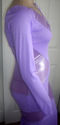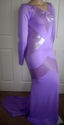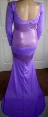 Girls! This MORGAN WELLS original is made of a beautiful lavender stretch knit with silver dots. It has sections of a lavender shimmer spandex through the midsection, a V neckline, and long straight sleeves. Use the "ZOOM" feature for a close look. The band go around the hips, and across the back. It is form fitting with a nice train, and is sized 12-16!