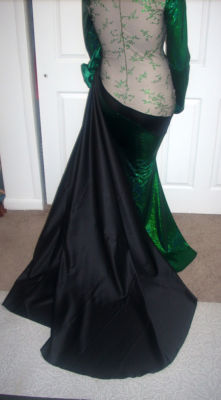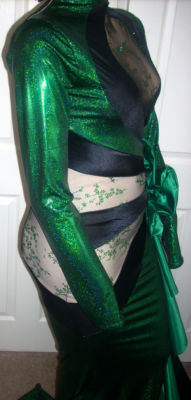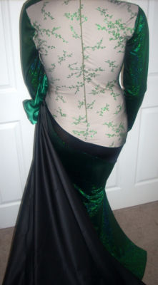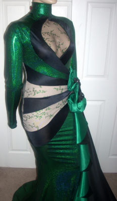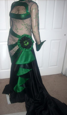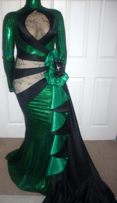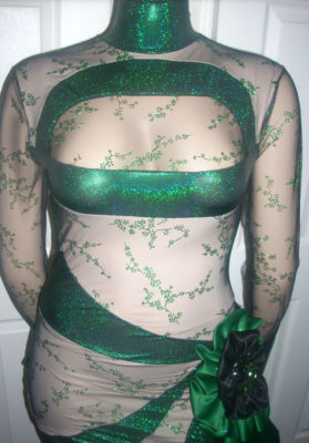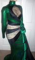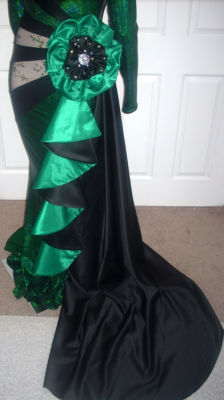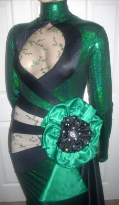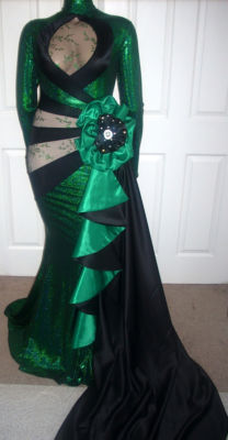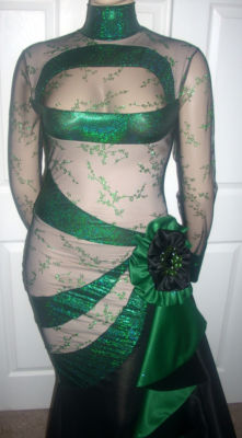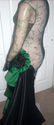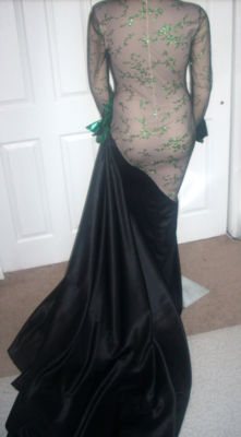 Girls! This is a fabulous item! This MORGAN WELLS original is made of a black stretch netting with green cracked ice flowers It is compleatly lined with a nude colored stretch lining except the cleavage. It has bands of green hologram spandex through the midsection, and around the bust. It has a deep opening in the front made of the black stretch netting with green flowers. If this opening in the front is too much for you, I can line it with nude lining before shipping. Just let me know. Use the "ZOOM" feature for a close look. The bottom of the dress from the hip down is made of the black stretch knit. It has long straight sleeves with cuffs, and a band collar, made of the green spandex. The bands through the midsection angle to the side where there is a huge side train made of a black satin. It has a beautiful rosette made of the black satin, and green satin with cracked ice, and huge black, and green stones in the center. Down the front of the train is a cascading ruffle made of the green cracked ice satin, and the black satin on the other. This dress has an invisible zipper up the back. It is form fitting with a fabulous train, and is sized 12-16!