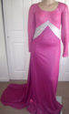 Girls! The empire style bodice of this PLUS SIZE MORGAN WELLS original is made of a beautiful bubblegum pink stretch knit with silver cracked ice. It has a scooped neckline, and long straight sleeves. Under the bust is a band of silver stretch confetti dot sequins. Use the "ZOOM" feature for a close look. The bottom of the dress from the bust down flares out, and is made of a slightly darker pink stretch knit with a silver shimmer. This dress has an invisible zipper up the back, and a fabulous train. It is sized at 20-24!