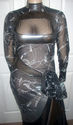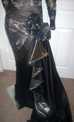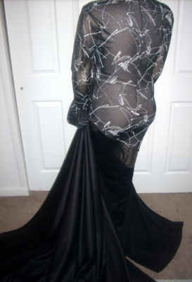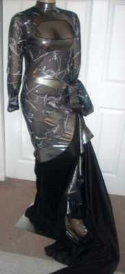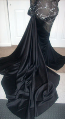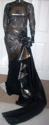 Girls! This is a fabulous item! This MORGAN WELLS original is made of a black, and silver semi sheer stretch netting with cracked ice. The design is silver squiggle lines. It is compleatly lined with a nude colored stretch lining except the cleavage. It has bands of silver spandex through the midsection, and around the bust. It has a deep opening in the front made of the black stretch netting with black sequins. If this opening in the front is too much for you, I can line it with nude lining before shipping. Just let me know. Use the "ZOOM" feature for a close look. The bottom of the dress from the hip down is made of the black stretch knit. It has long straight sleeves, and a band collar, made of the silver spandex. The bands through the midsection angle to the side where there is a huge side train made of a black satin. It has a beautiful ruffle made of the cracked ice, and the silver spandex. Down the front of the train is a cascading ruffle made of the silver spandex on one side, and the black satin on the other. This dress has an invisible zipper up the back. It is form fitting with a fabulous train, and is sized 12-16!