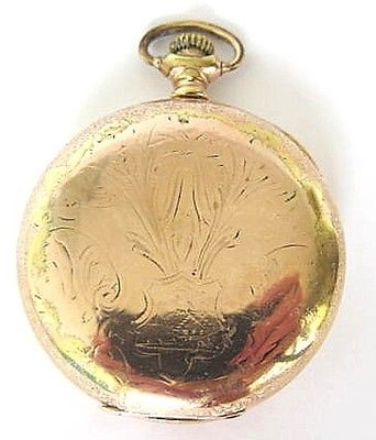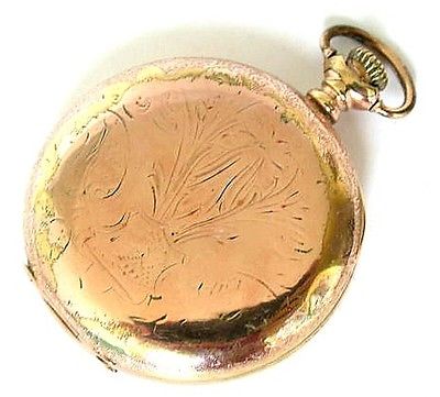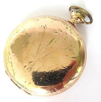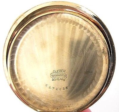 The 10K goldfilled Hunter case is provided by Deuber Co ,warranted 20 years,inside of the case is clean,some tarnish on the outside around the edge of the case,not monogrammed awaiting yours but the dust cover is etched with name of previous owner.The design on both sides of the case is floral leaves and stems , measures 2 by 2 1/2 inches ,weighs a hefty 103.4 grams.