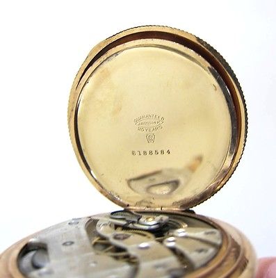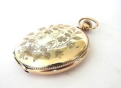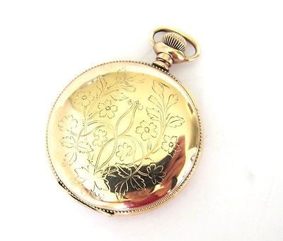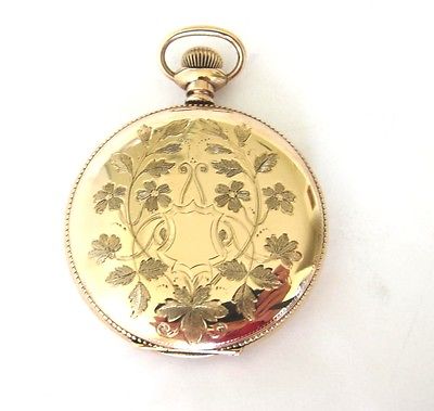 This is a beautiful pocket watch made by Longines Co of Switzerland,14K goldfilled hunter case with damascene flowers motif on one side(empty cartouche,awaiting yours) and plain flower motifs on the back,size is Swiss 17 and our size USA 12,weighs 74.4 grams.