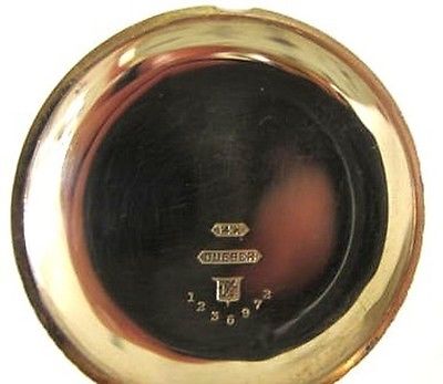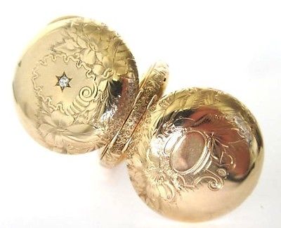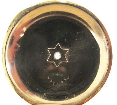 The 14 solid gold hunter case is provided by Deuber 14k with anchor trademark raised (not engraved which is goldfilled) ,serial number 1236972,,not monogrammed,one cover has a shiny sparkling diamond.,gold is shiny and full of lustre,no pitting,some scratches on the dust cover where someone tried to open to see the movement.