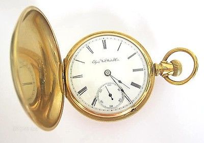 Antique circa 1888 14K goldfilled pocket watch by ELGIN,hunter case,not monogrammed,serial number 2935121,SIZE 18,13-15 Jewels,movement said GM Wheeler,grade 82,serviced in 2009,2010,2010 and 2011,runs.