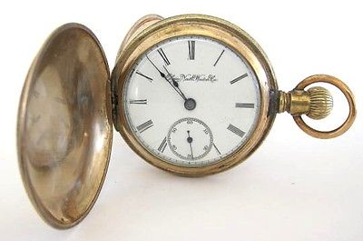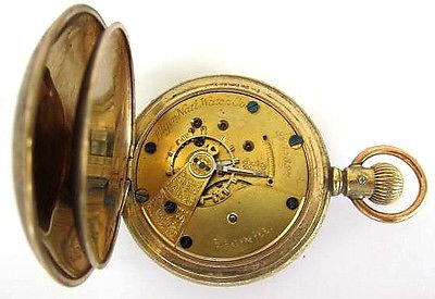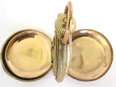 The 10k goldfilled hunter case is not marked ,serial number 3259495,good condition and not monogrammed,both sides are etched with floral scenes,outside cover has dents but inside is clean with no visible dings or dents.