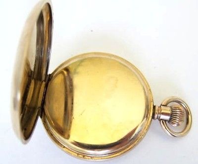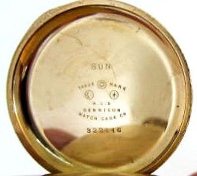 Hunter case is provided by Dennison watch case co,with 3 logos and the word 'SUN',English make,guaranteed to be made of two plates of 14 ctK gold with plates of composition between and to wear 25 years,322146 12.