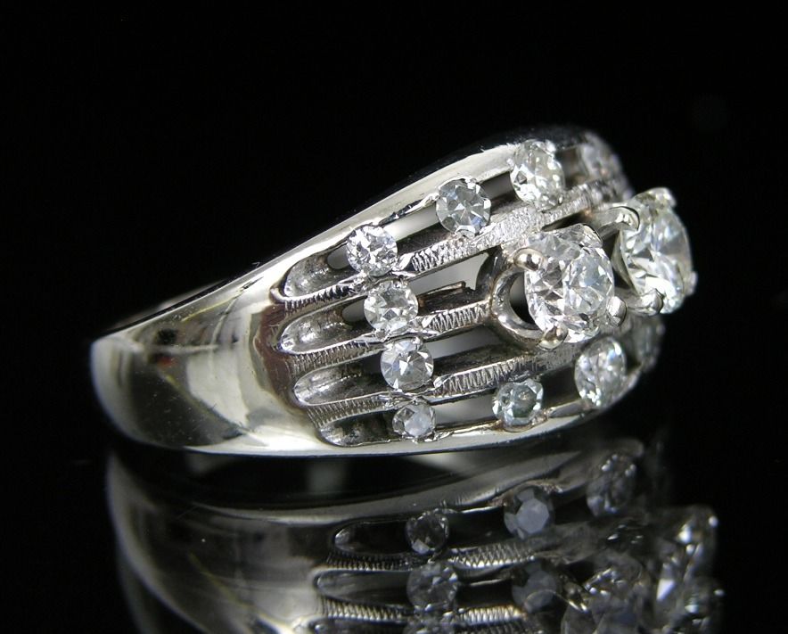 14K white gold ring with a split design mounting featuring channel set full and single cut diamonds and 3 prong set round brilliant cut diamonds in the center.