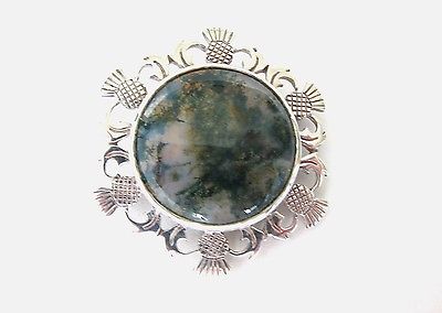 Handcrafted by Ortak of Scotland,sterling silver brooch with a genuine blue moss stone. The stone measures 1 inch wide (25mm).