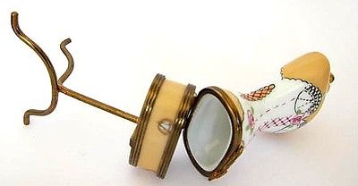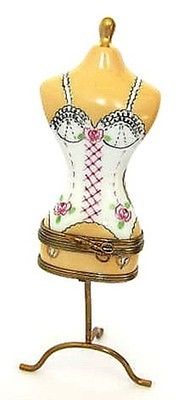 genuine handpainted and signed limoge porcelain box from France,MIB mint in box condition,it is a mannequin with white lace corset on stand with scissor clasp,inside is a golden heart ,signed by the artist ,color vibrant ,condition perfect, 5 1/4 inches tall .