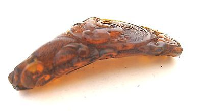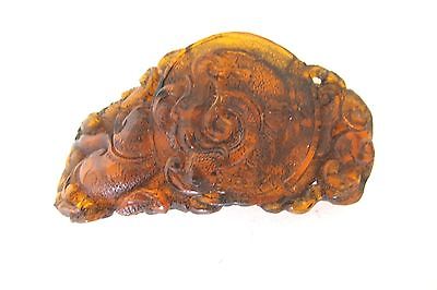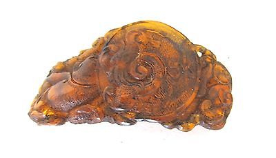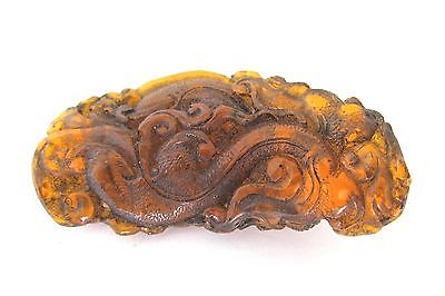 this is not a netsuke or an okimono,and not from Japan. It is a replica of an ancient emblem of China,dated to Tang Dynasty,features a so called grass dragon which is found in Northwestern China. The emblem may have some military significance,as the original is in the hands of an important Chinese family and passed down from generation to generation,the maker obtained permission to make these replica copies. As you can see from the pictures,the dragon and the surrounding motifs are in raised relief,the piece is over 2 inches long and is not flat,more like a belt buckle lying on flat surface. Condition very good and made of reconstituted amber.