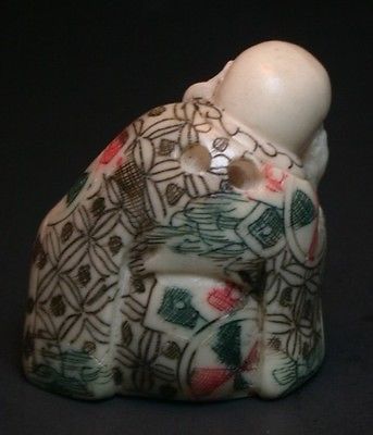 | good condition,1 1/2   inches  tall  ,made of composite material,2  holes We have the largest collection of netsukes on Ebay,interesting theme,affordbale prices and great condition(old new stock),girls,boys,geisha.mouse,monkey,horse,cows,samurai,sumo wrestler,frog,chicken,rooster,swan,geese,duck,dolphin,fox,snake,tiger,lion,lohan,buddha hotei,kwan yin,masks,cicada,loathesome people,good people we have them all.   Many of these netsukes have been out of production years ago .  |