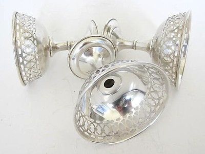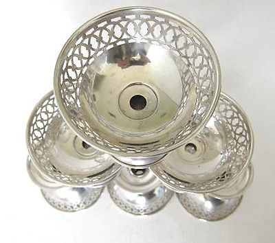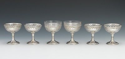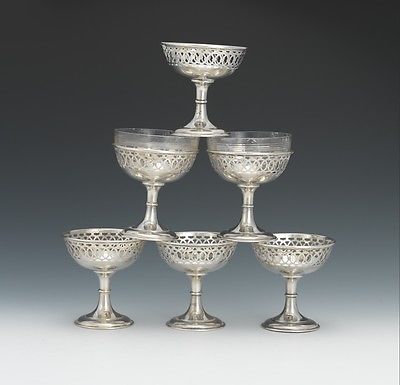 A silver collector cannot ask for more from this artistic sterling silver set of 6 desert bowl with stems for sherbert,icecream,jello,pudding ,marked Meriden Brittania Co and Sterling on the bottom,monogrammed and 2 have glass inserts,please see all pictures.