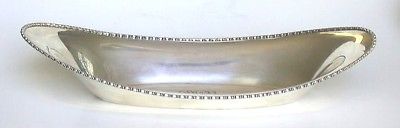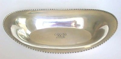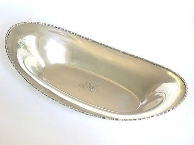 Sterling Silver bread tray or platter by Meriden of Meriden ,CT which was taken over by Intl Silver in 1898,this beautiful piece bears the Meriden mark on the bottom,sterling and #605,12 wide 6 1/2 inches deep and 2 1/2 inches tall,with beaded border,hand engraved initials,weighs a hefty 9.35 troy ounces.