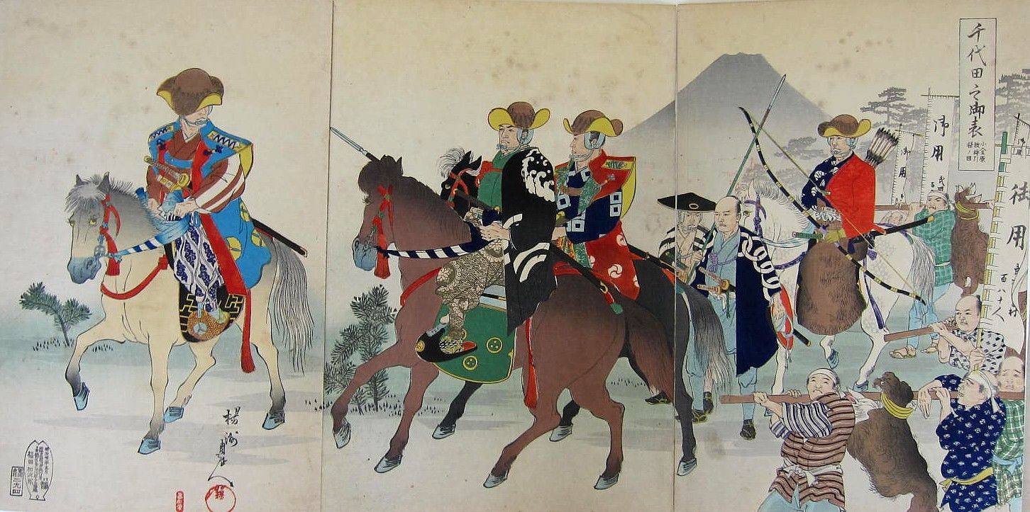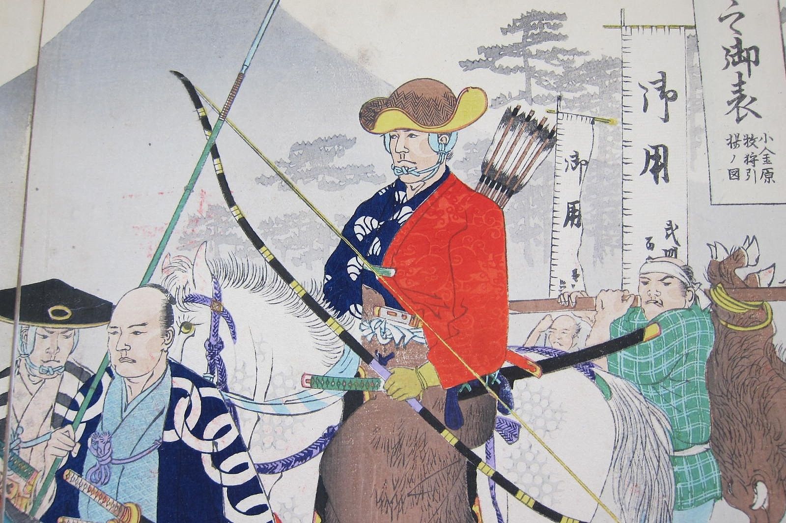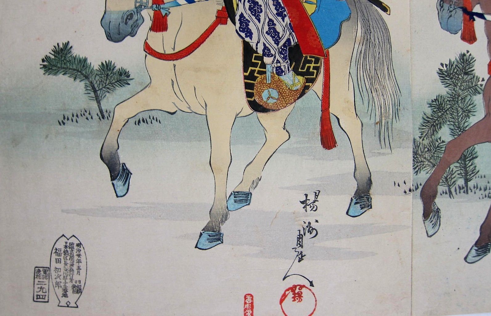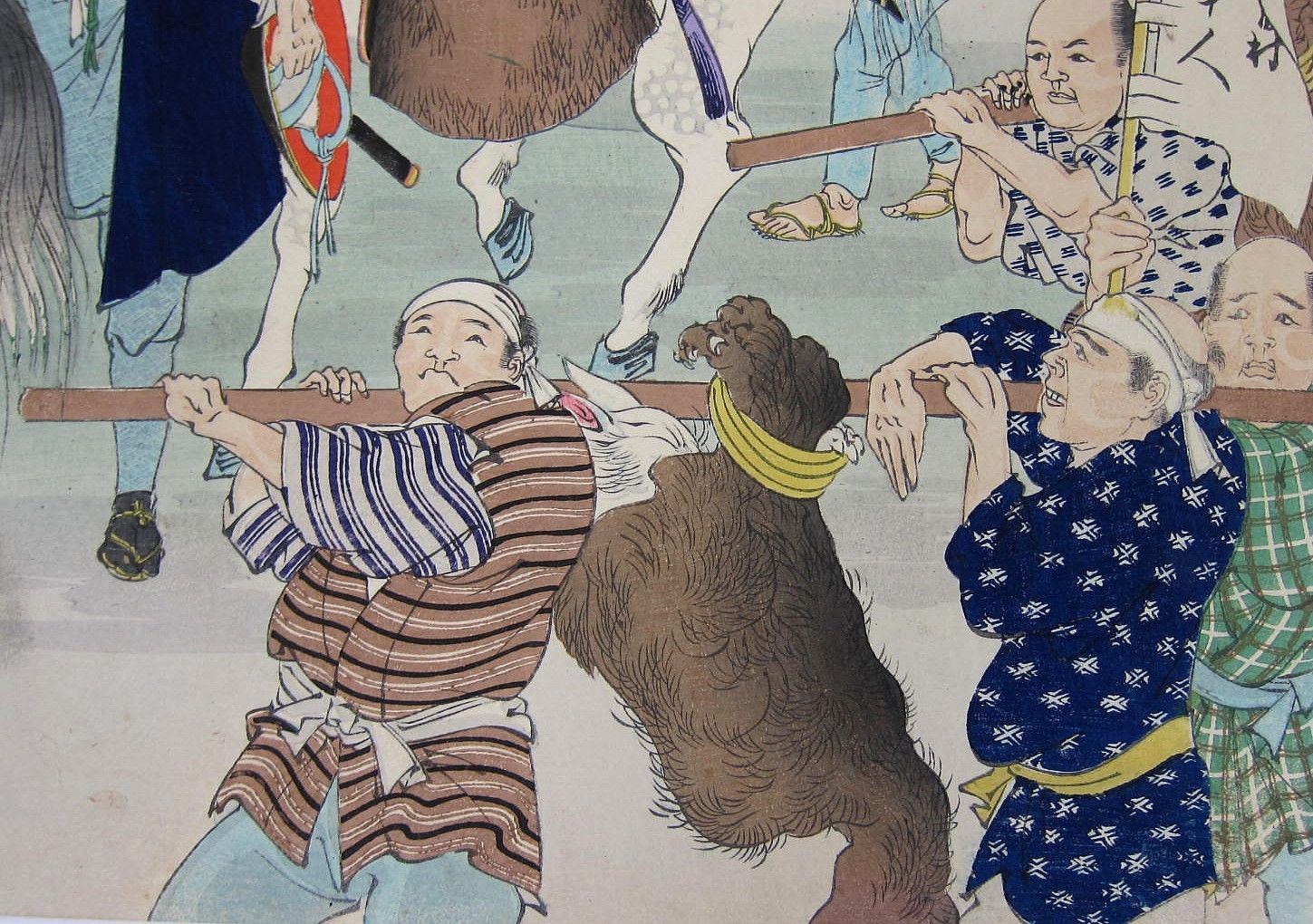 Genuine japanese woodblock print by Chikanobu Toyohara, 3 oban triptych (70.9x 35.5cm),impression and colors very good,condition soiled with Meiji album backing. Titled 'Chiypda no-no omote mokuroku,which translates to events of Prince Tokugawa outside the Chiyoda castle. Scene of WILD BOAR hunt. High level clan members coming home triumphantly with their prize-wild boars strapped and tied to poles carried by underlings,I see two,probably more not shown in the prints,see all the high honchos with banners ,riding on majectic horses ,they all carry their set of samurai swords,one is also an archer so he has bows and arrow as well,the archer seems to have a piece of wild boar sking draped over his horse?? Colorful costumes,majestic horses brown and white strutting ,you see the wild boars on the right of the triptych,artist seal and signature to the left/ Condition is not as good as the other triptychs of the same series,we are discounting this print for reason that although it is backed and color and impression both good,there are stains but no pin holes I can see,overrall a nice print for the money. Dated Meiji 30th year which takes us to 1898,a nice piece of antique