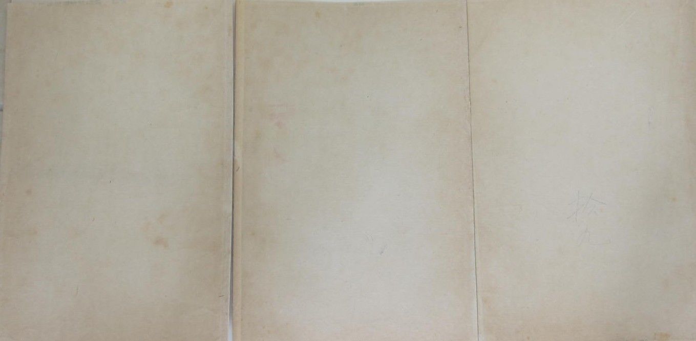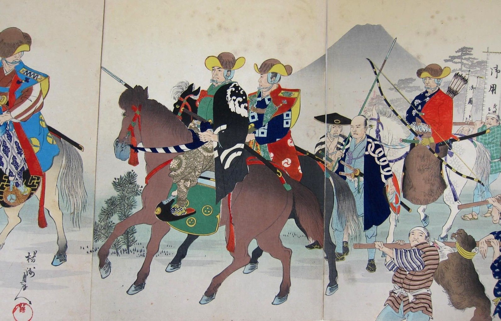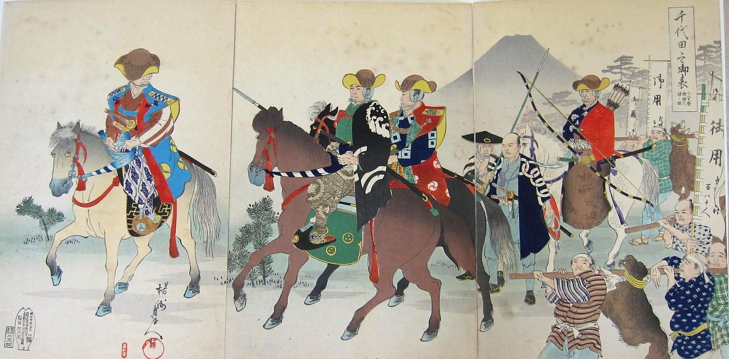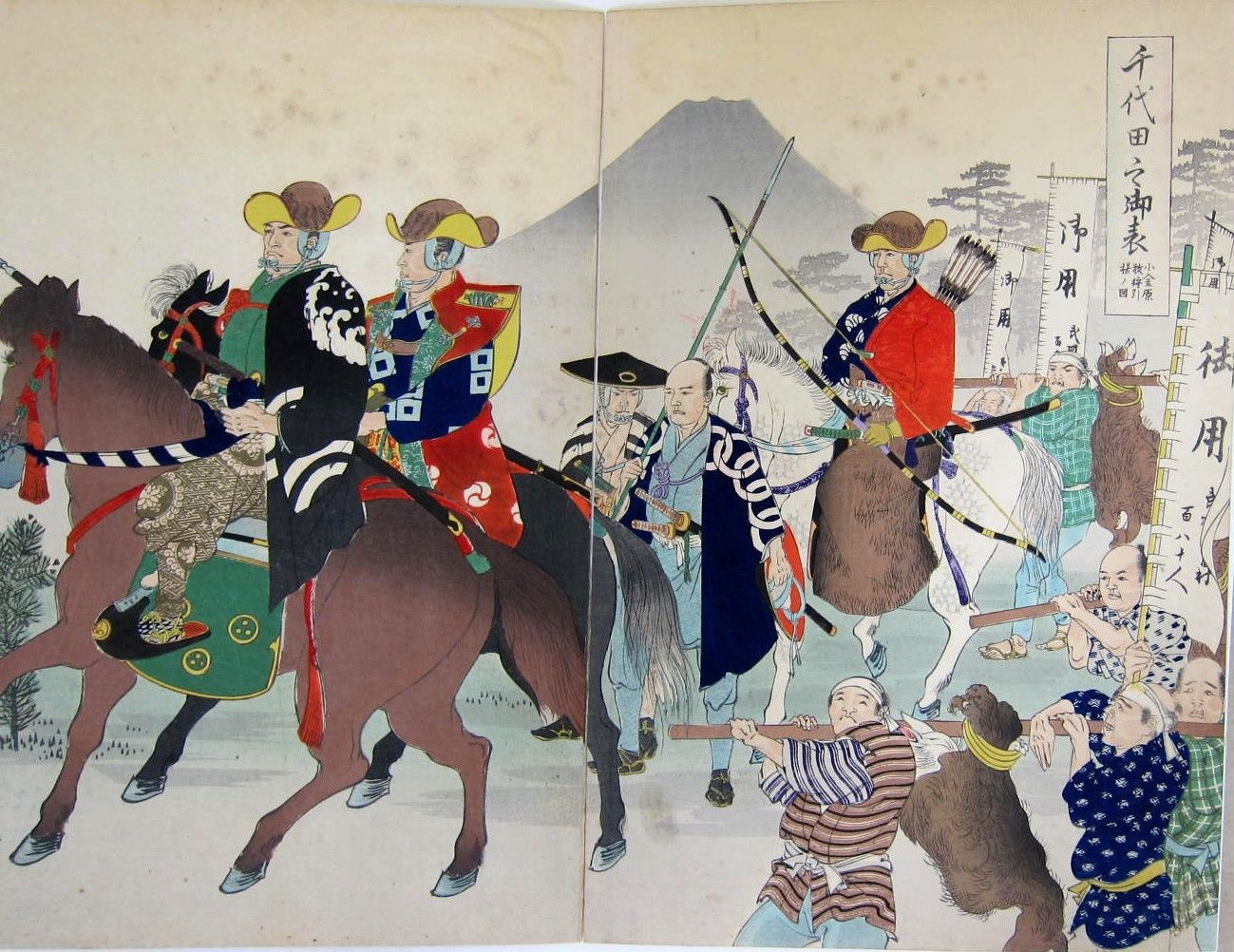 Genuine japanese woodblock print by Chikanobu Toyohara, 3 oban triptych (70.9x 35.5cm),impression and colors very good,condition soiled with Meiji album backing. Titled 'Chiypda no-no omote mokuroku,which translates to events of Prince Tokugawa outside the Chiyoda castle. Scene of WILD BOAR hunt. High level clan members coming home triumphantly with their prize-wild boars strapped and tied to poles carried by underlings,I see two,probably more not shown in the prints,see all the high honchos with banners ,riding on majectic horses ,they all carry their set of samurai swords,one is also an archer so he has bows and arrow as well,the archer seems to have a piece of wild boar sking draped over his horse?? Colorful costumes,majestic horses brown and white strutting ,you see the wild boars on the right of the triptych,artist seal and signature to the left/ Condition is not as good as the other triptychs of the same series,we are discounting this print for reason that although it is backed and color and impression both good,there are stains but no pin holes I can see,overrall a nice print for the money. Dated Meiji 30th year which takes us to 1898,a nice piece of antique