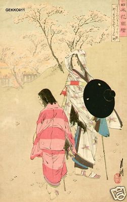 Genuine antique Japanese woodblock print by Gekko Ogata(1859-1920),titled Beauties and cherry blossoms of the Japanese flowers series,signed and sealed on lower right corner of the print. Date of print circa 1890,size is 12 1/2 by 8 inches. Impression good,color good and condition good with album backing ,trimmed into image.