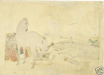 | Genuine Japanese woodblock print - part of Hokusai Katsushika  Tokaido series,a traveller washing his horse at Hodogaya station. Signature gakyojin Hokusai ga in cartouche Period Edo Impression very good ... printed on a soft deluxe paper Colors very good Condition good ...  thinning of upper and lower areas repaired, Format Koban Width 7.3 inches = 18.5 cm Height 5.1 inches = 13.0 cm