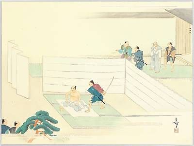 Genuine antique Japanese woodblock print titled 'Seppuku,Chushingura' bY Etsudo Olake(1876-1930),signed Etsudo,dated 1910-1920. After the raid,the 47 ronin committed suicide,they were buried next to their master Lord Asano at Sengaku-ji Temple. The print measures 13.4 by 9.8 inches,condition excellent,impression excellent and colors very good with gold colored metalic pigment (gofun).