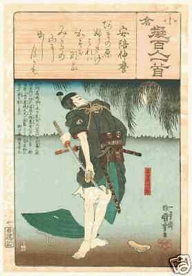 An Edo period print "Ogura Nazorae Hyakunin Isshu" (Ogura Imitation of 100 Poems by 100 Poets),the Poem is by Abe-no-Nakamaro, "When I look up at the wide-stretched plain of heaven, is the moon the same that rose on Mt. Mikasa in the land of Kasuga?" Nagoya Sanzaburo, who avenged his father's death, is in the lower cartouche. Format is Oban tate-e 9.8 x 14.2 inches(25.0 x 36 cm) Artist is Kuniyoshi Utagawa 1797-1861 Signature ichiyusai Kuniyoshi ga Seal kiri Dated 1842 - 47 ,Edo period Publisher Ibasen,censor Kinugasa Impression,colors and condition are all very good ,backed by thin paper,