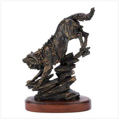 Every inch of this mighty wolf radiates power and beauty, captured here in his natural grandeur. With a gleaming faux bronze finish and a handsome wood-like base, this theatrical statue has the look of a genuine museum quality masterpiece! Weight 3.6 lbs. 9" x 5" x 13 1/4" high. Polyresin.