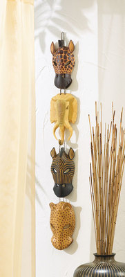 34759 Exotic wall plaque with giraffe, elephant, zebra and leopard masks. Alabastrite. 1 1/2" x 3 5/8" x 27 1/4" high.