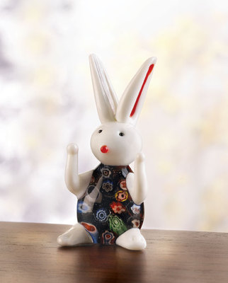 This little bunny hops into your heart, bringing with him the joyful images of spring. Unique figurine is cast in pure white opaque glass, brightened with a bouquet of colorful blooms. Weight 0.2 lb. Millefiori glass. 1 1/2" x 1 3/8" x 3 1/8" high.