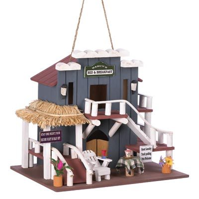 Savvy travelers know best - this birdhouse inn stands out from the rest! You'll delight at the lifelike details from the railings and thatched roof right down to the charming checkered tablecloth. Clean-out hole on back. Hanging loop at top. Weight 2 lbs. 10 1/4" x 7?" x 8?" high. Wood.