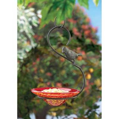 Expect happy guests to fly in for the feast served in this lovely hand-blown glass bowl feeder. Striking perfect harmony between the strength of the metal framework and the delicate beauty of the red and yellow glass serving dish, this feeder's molded metal bird motif will encourage all of your feathered friends to flock when you fill it with their favorite seeds and feed.