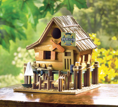 32188 A rustic resort in which feathered friends can weather the storm, the wooden "yacht club" has a straw roof, a wooden dock, a sailboat, and oars in front. 9 3/8" x 8" x 9 7/8" high.