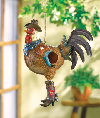 37973 This hilarious birdhouse is literally a "bird house"! All dressed up in his Western finery, a plump brown "bucka-rooster" offers ample shelter to his fellow feathered friends. Free-swinging cowboy boot feet dance an amusing two-step in the slightest breeze! Polyresin with metal tail. 10 1/4" x 5 1/8" x 13" long.