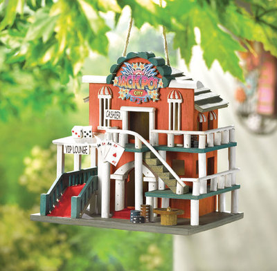 Cute little casino provides a heavenly lounge for any lucky high-rolling flyers! Whimsically outfitted with classic roadhouse trimmings; dice, chips, roulette wheel and cards - it even rolls out a red-carpet welcome! Wood with polyresin trim. 9 1/2" x 7 3/4" x 10" high.