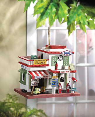 39563 Whimsical birdhouse recalls the bygone days when the car was king and gas stations ruled the roadside! Delightfully decorated with an array of authentic service station touches. All-wood construction features a generous entrance and a roomy shelter for a feathered family. Rope at top for hanging. Wood. 10 1/4" x 8" x 9" high.