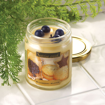Begin the day with the luscious scent of home baked blueberry muffins. . . the aroma is oh-so-tempting! Long-burning candle is playfully topped with colorful faux blueberries. 7. 3 oz. jar. Made in the U.S.A. Soy blend wax with glass lidded jar. 2 3/4" diameter x 3 1/2" high.