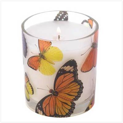 Butterflies flutter their colorful wings on all sides of a wonderful 7 oz. wild orchid scented decorative candle, bringing to mind the sights and scents of a carefree summer day. A true sensory delight that fills the air with a gentle hint of fragrance! Burns up to 35 hours. Weight 0.8 lb. Paraffin wax; glass container. 3" diameter x 3 1/4" high.