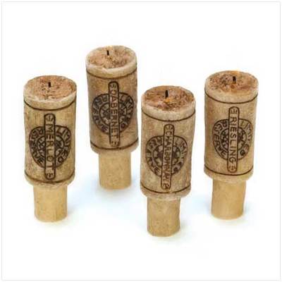 Recreate the romance of your favorite wine bistro! Whimsical wine cork candles fit into the neck of your empty bottles, creating a refined display that will delight any gourmet; lifelike wine fragrance adds a luscious touch. Each candle burns up to 4 hours. Weight 0.2 lb. Each is 1" diameter x 3" high. Paraffin wax. Set of 4